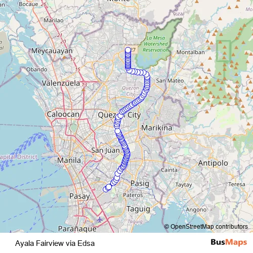 The first stop of the Ayala Fairview via Edsa bus route is Epifanio de los Santos Av, Makati City, Manila and the last stop is SM Public Transport Terminal, Regalado Highway, Quezon City. Ayala Fairview via Edsa (Ayala Fairview via Edsa) is operational during everyday.