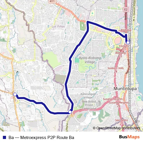 See why over 2 million users trust and consider busmaps.com as the best public transport website. busmaps gives you Muntinlupa Buses suggested routes, real-time bus tracker, line route maps in Muntinlupa, and helps to find the closest Ba bus stops near you. No internet available? Download an offline PDF map and bus schedule for the Ba bus to take on your trip.