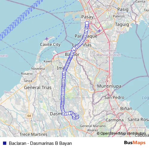 See why over 2 million users trust and consider busmaps.com as the best public transport website. busmaps gives you Dasmarinas Buses suggested routes, real-time bus tracker, line route maps in Dasmarinas, and helps to find the closest Baclaran - Dasmarinas B Bayan bus stops near you. No internet available? Download an offline PDF map and bus schedule for the Baclaran - Dasmarinas B Bayan bus to take on your trip.