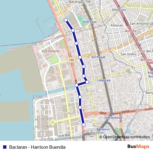 The first stop of the Baclaran - Harrison Buendia bus route is Roxas Blvd, Parañaque City, Manila and the last stop is Hospital, A.Mabini, Manila. Baclaran - Harrison Buendia (Baclaran - Harrison Buendia) is operational during everyday.