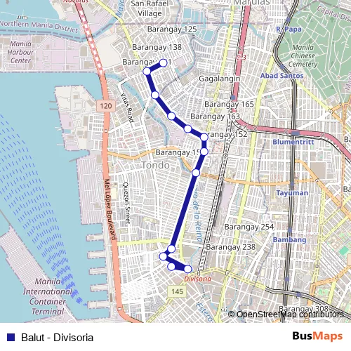 See why over 2 million users trust and consider busmaps.com as the best public transport website. busmaps gives you Manila Buses suggested routes, real-time bus tracker, line route maps in Manila, and helps to find the closest Balut - Divisoria bus stops near you. No internet available? Download an offline PDF map and bus schedule for the Balut - Divisoria bus to take on your trip.