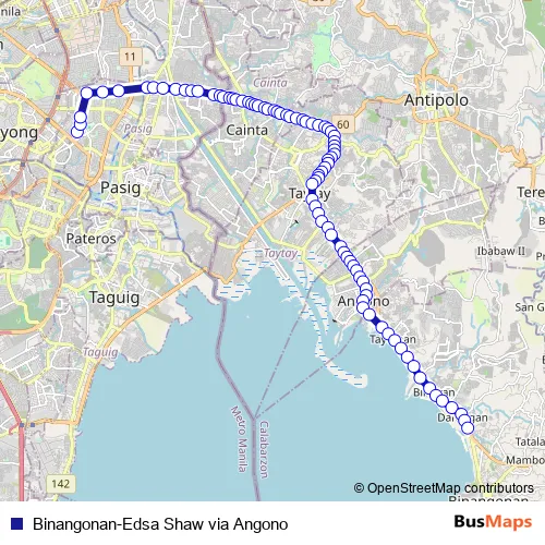 Additional information: Binangonan-Edsa Shaw via Angono has 86 stops and the total trip duration for this route is approximately 111 minutes.