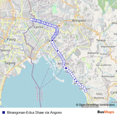 Additional information: Binangonan-Edsa Shaw via Angono has 73 stops and the total trip duration for this route is approximately 82 minutes.