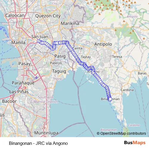See why over 2 million users trust and consider busmaps.com as the best public transport website. busmaps gives you Pasig City Buses suggested routes, real-time bus tracker, line route maps in Pasig City, and helps to find the closest Binangonan - JRC via Angono bus stops near you. No internet available? Download an offline PDF map and bus schedule for the Binangonan - JRC via Angono bus to take on your trip.