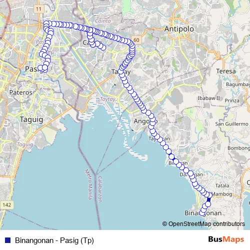 Additional information: Binangonan - Pasig (Tp) has 135 stops and the total trip duration for this route is approximately 152 minutes.