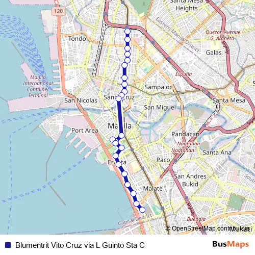 The first stop of the Blumentrit Vito Cruz via L Guinto Sta C bus route is Light Rail Transportation 1, Manila and the last stop is