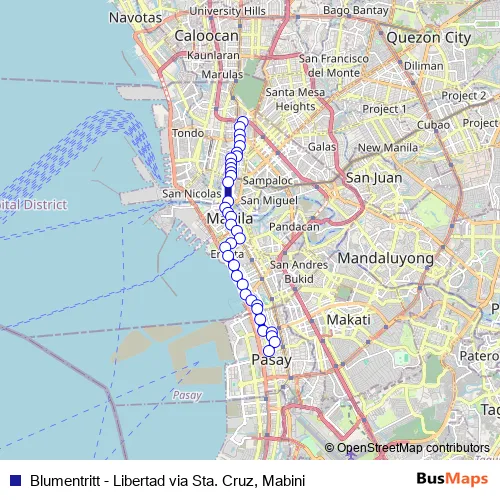 The first stop of the Blumentritt - Libertad via Sta. Cruz, Mabini bus route is Old Antipolo / Felix Huetas Intersection, Quezon City and the last stop is