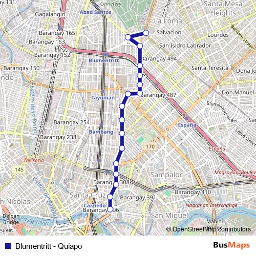 See why over 2 million users trust and consider busmaps.com as the best public transport website. busmaps gives you Manila Buses suggested routes, real-time bus tracker, line route maps in Manila, and helps to find the closest Blumentritt - Quiapo bus stops near you. No internet available? Download an offline PDF map and bus schedule for the Blumentritt - Quiapo bus to take on your trip.