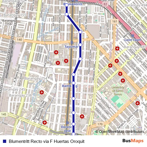 The first stop of the Blumentritt Recto via F Huertas Oroquit bus route is LRT Doroteo Jose-Recto Station Walkway / Rizal Avenue Intersection, Manila and the last stop is