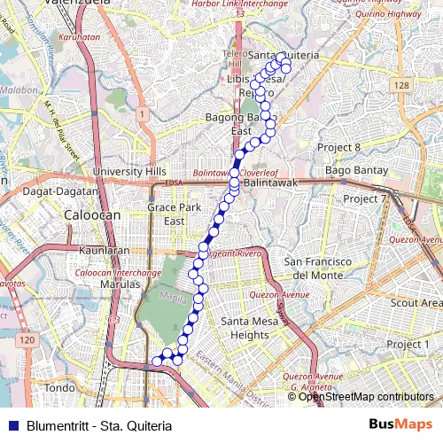 The first stop of the Blumentritt - Sta. Quiteria bus route is Ferdinand Blumentritt / Felix Huertas Intersection, Quezon City and the last stop is Roxas, Quirino Highway, Quezon City. Blumentritt - Sta. Quiteria (Blumentritt - Sta. Quiteria) is operational during everyday.
