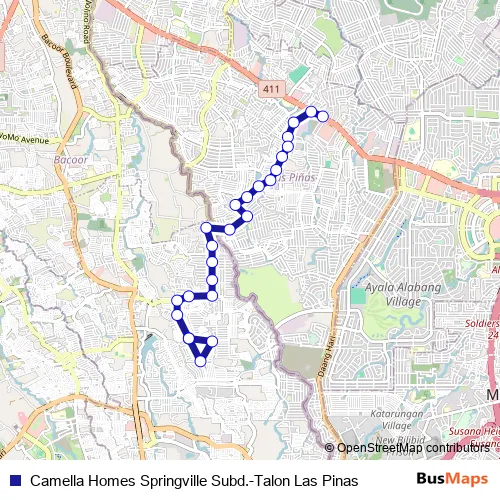 The first stop of the Camella Homes Springville Subd.-Talon Las Pinas bus route is Alabang-Zapote Road / Southmall Access Rd Intersection, Muntinlupa City, Manila and the last stop is Everlasting St, Bacoor City, Manila. Camella Homes Springville Subd.-Talon Las Pinas (Camella Homes Springville Subd.-Talon Las Pinas) is operational during everyday.