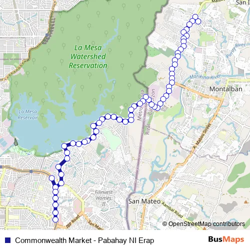 The first stop of the Commonwealth Market - Pabahay NI Erap bus route is Un- named Road, Rodriguez and the last stop is Commonwealth Avenue, Quezon City. Commonwealth Market - Pabahay NI Erap (Commonwealth Market - Pabahay NI Erap) is operational during everyday.