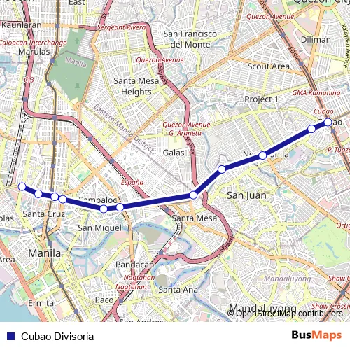 The first stop of the Cubao Divisoria bus route is Claro M. Recto Ave / Jose Abad Santos Ave. Intersection, Manila and the last stop is Aurora Blvd / Epifanio de los Santos Avenue Intersection, Quezon City, Manila. Cubao Divisoria (Cubao Divisoria) is operational during everyday.