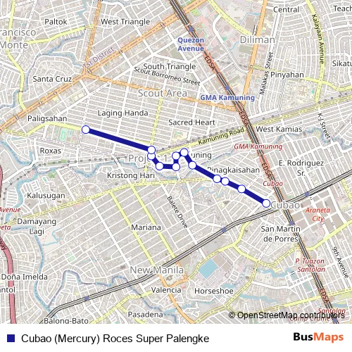 See why over 2 million users trust and consider busmaps.com as the best public transport website. busmaps gives you Quezon City Buses suggested routes, real-time bus tracker, line route maps in Quezon City, and helps to find the closest Cubao (Mercury) Roces Super Palengke bus stops near you. No internet available? Download an offline PDF map and bus schedule for the Cubao (Mercury) Roces Super Palengke bus to take on your trip.