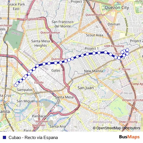 The first stop of the Cubao - Recto via Espana bus route is España Blvd / Nicanor Reyes St Intersection, Manila and the last stop is Aurora Blvd / Epifanio de los Santos Avenue Intersection, Quezon City, Manila. Cubao - Recto via Espana (Cubao - Recto via Espana) is operational during everyday.