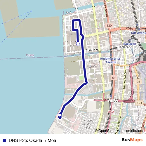 The first stop of the DNS P2p: Okada → Moa bus route is Okada and the last stop is MOA/South Wing. DNS P2p: Okada → Moa (DNS P2p: Okada → Moa) is operational during everyday.