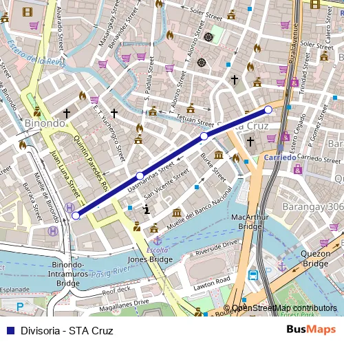The first stop of the Divisoria - STA Cruz bus route is A F. Torres / Ronquillo Intersection, Manila and the last stop is Dasmariñas / Juan Luna Intersection, Manila. Divisoria - STA Cruz (Divisoria - STA Cruz) is operational during everyday.