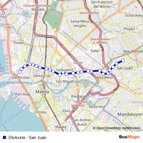 See why over 2 million users trust and consider busmaps.com as the best public transport website. busmaps gives you Manila Buses suggested routes, real-time bus tracker, line route maps in Manila, and helps to find the closest Divisoria - San Juan bus stops near you. No internet available? Download an offline PDF map and bus schedule for the Divisoria - San Juan bus to take on your trip.