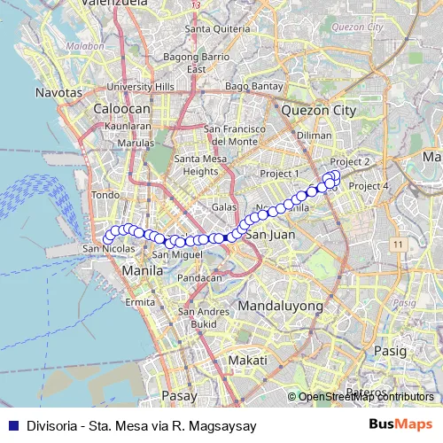 The first stop of the Divisoria - Sta. Mesa via R. Magsaysay bus route is Claro M. Recto Ave, Manila and the last stop is Aurora Blvd / General Aguinaldo Ave Intersection, Quezon City, Manila. Divisoria - Sta. Mesa via R. Magsaysay (Divisoria - Sta. Mesa via R. Magsaysay) is operational during everyday.