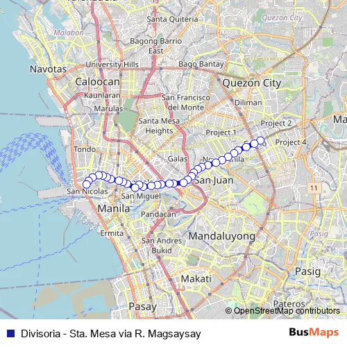 See why over 2 million users trust and consider busmaps.com as the best public transport website. busmaps gives you Manila Buses suggested routes, real-time bus tracker, line route maps in Manila, and helps to find the closest Divisoria - Sta. Mesa via R. Magsaysay bus stops near you. No internet available? Download an offline PDF map and bus schedule for the Divisoria - Sta. Mesa via R. Magsaysay bus to take on your trip.