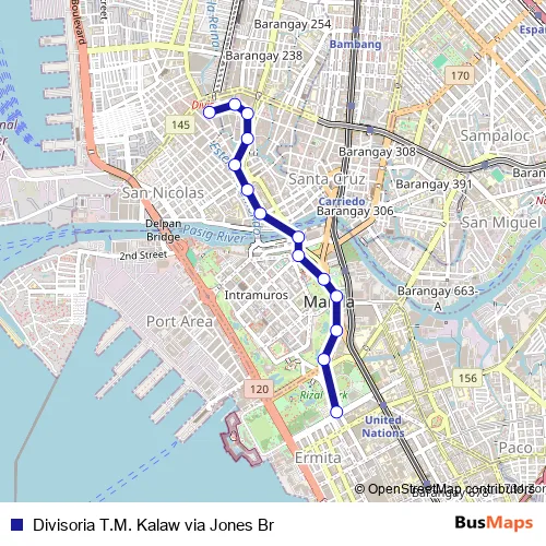 See why over 2 million users trust and consider busmaps.com as the best public transport website. busmaps gives you Manila Buses suggested routes, real-time bus tracker, line route maps in Manila, and helps to find the closest Divisoria T.M. Kalaw via Jones Br bus stops near you. No internet available? Download an offline PDF map and bus schedule for the Divisoria T.M. Kalaw via Jones Br bus to take on your trip.