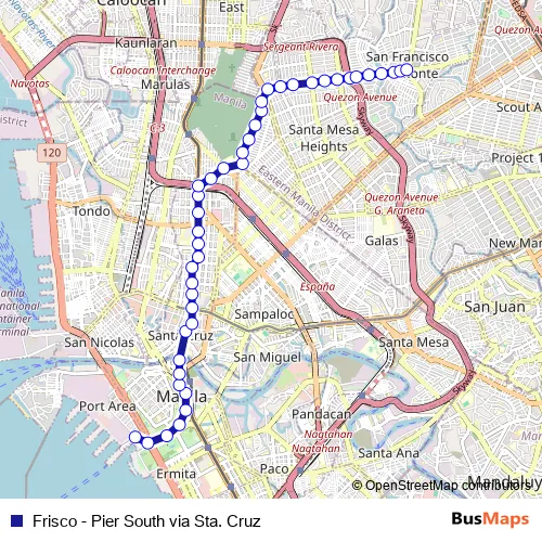See why over 2 million users trust and consider busmaps.com as the best public transport website. busmaps gives you Manila Buses suggested routes, real-time bus tracker, line route maps in Manila, and helps to find the closest Frisco - Pier South via Sta. Cruz bus stops near you. No internet available? Download an offline PDF map and bus schedule for the Frisco - Pier South via Sta. Cruz bus to take on your trip.