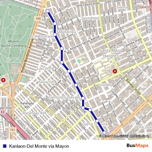 The first stop of the Kanlaon-Del Monte via Mayon bus route is Kanlaon, Quezon City and the last stop is N. S. Amoranto, Quezon City. Kanlaon-Del Monte via Mayon (Kanlaon-Del Monte via Mayon) is operational during everyday.