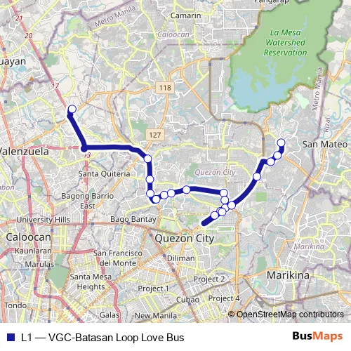 The first stop of the L1 bus route is VGC Departures and the last stop is Batasan Road & Dswd Compound. L1 (VGC-Batasan Loop Love Bus) is operational during everyday.