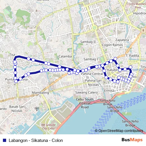 See why over 2 million users trust and consider busmaps.com as the best public transport website. busmaps gives you Cebu City Buses suggested routes, real-time bus tracker, line route maps in Cebu City, and helps to find the closest Labangon - Sikatuna - Colon bus stops near you. No internet available? Download an offline PDF map and bus schedule for the Labangon - Sikatuna - Colon bus to take on your trip.