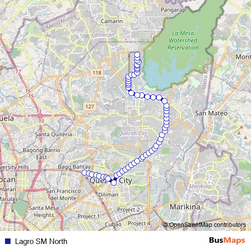 The first stop of the Lagro SM North bus route is Epifanio de los Santos Avenue / North Avenue Intersection, Quezon City and the last stop is Ascencion Avenue / Caridad Intersection, Quezon City. Lagro SM North (Lagro SM North) is operational during everyday.