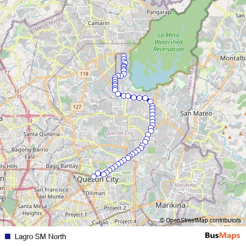 The first stop of the Lagro SM North bus route is Ascencion Avenue / Caridad Intersection, Quezon City and the last stop is North Avenue, Quezon City. Lagro SM North (Lagro SM North) is operational during everyday.