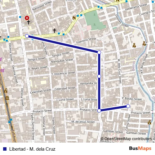 The first stop of the Libertad - M. dela Cruz bus route is Antonio Arnaiz Ave / P.Zamora Intersection, Manila and the last stop is M. dela Cruz St, Lungsod ng Pasay, Manila. Libertad - M. dela Cruz (Libertad - M. dela Cruz) is operational during everyday.