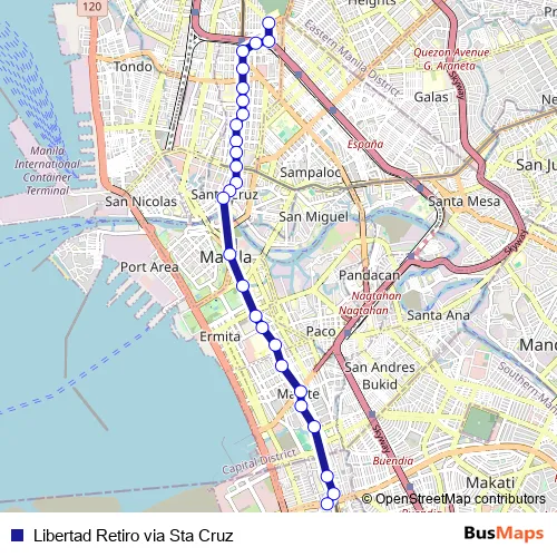 See why over 2 million users trust and consider busmaps.com as the best public transport website. busmaps gives you Manila Buses suggested routes, real-time bus tracker, line route maps in Manila, and helps to find the closest Libertad Retiro via Sta Cruz bus stops near you. No internet available? Download an offline PDF map and bus schedule for the Libertad Retiro via Sta Cruz bus to take on your trip.