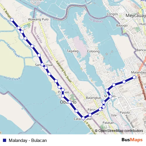 The first stop of the Malanday - Bulacan bus route is A. Fernando Elementary School, M H Del Pilar, Malanday, Valenzuela City and the last stop is F. Balagtas, Obando. Malanday - Bulacan (Malanday - Bulacan) is operational during everyday.
