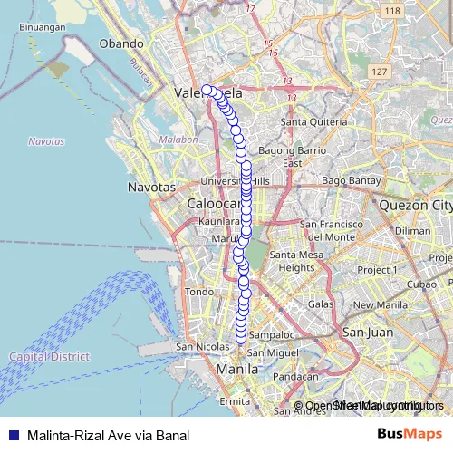 See why over 2 million users trust and consider busmaps.com as the best public transport website. busmaps gives you Caloocan Buses suggested routes, real-time bus tracker, line route maps in Caloocan, and helps to find the closest Malinta-Rizal Ave via Banal bus stops near you. No internet available? Download an offline PDF map and bus schedule for the Malinta-Rizal Ave via Banal bus to take on your trip.