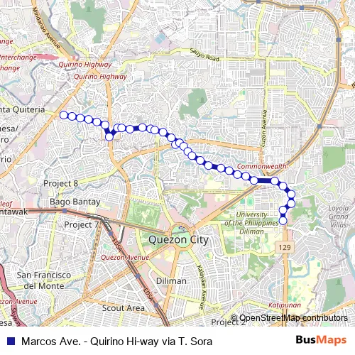See why over 2 million users trust and consider busmaps.com as the best public transport website. busmaps gives you Quezon City Buses suggested routes, real-time bus tracker, line route maps in Quezon City, and helps to find the closest Marcos Ave. - Quirino Hi-way via T. Sora bus stops near you. No internet available? Download an offline PDF map and bus schedule for the Marcos Ave. - Quirino Hi-way via T. Sora bus to take on your trip.