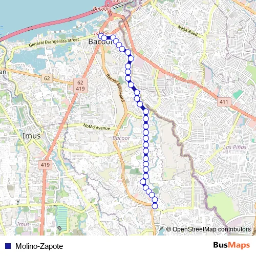See why over 2 million users trust and consider busmaps.com as the best public transport website. busmaps gives you Las Pinas Buses suggested routes, real-time bus tracker, line route maps in Las Pinas, and helps to find the closest Molino-Zapote bus stops near you. No internet available? Download an offline PDF map and bus schedule for the Molino-Zapote bus to take on your trip.
