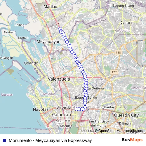 Additional information: Monumento - Meycauayan via Expressway has 50 stops and the total trip duration for this route is approximately 59 minutes.