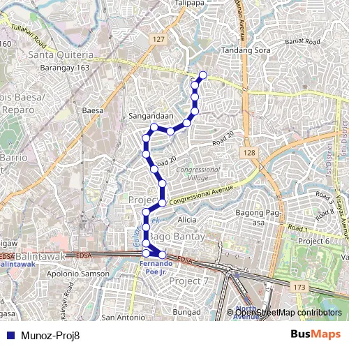 The first stop of the Munoz-Proj8 bus route is Epifanio de los Santos Avenue / Congressional Avenue Intersection, Quezon City and the last stop is Jetti Petrol Station, Tanding Sora Avenue, Quezon City. Munoz-Proj8 is operational during everyday.