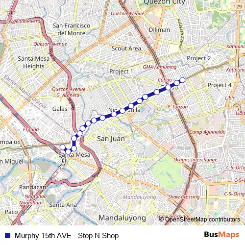 The first stop of the Murphy 15th AVE - Stop N Shop bus route is General Romulo Ave / Aurora Blvd Intersection, Quezon City, Manila and the last stop is Internet Cafe, Old Sta. Mesa, Manila. Murphy 15th AVE - Stop N Shop (Murphy 15th AVE - Stop N Shop) is operational during everyday.