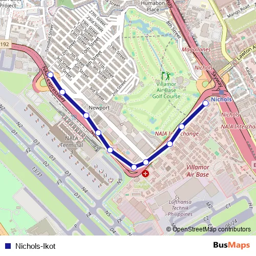The first stop of the Nichols-Ikot bus route is Sales Road, Pasay City, Manila and the last stop is Villamor Health Center, Andrews Ave, Lungsod ng Pasay, Manila. Nichols-Ikot is operational during everyday.