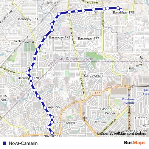 The first stop of the Nova-Camarin bus route is San Vicente / Camarin Road Intersection, Caloocan City and the last stop is Topaz, Caloocan City. Nova-Camarin is operational during everyday.