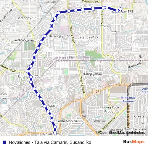 The first stop of the Novaliches - Tala via Camarin, Susano Rd bus route is Ramirez / Quirino Highway, Caloocan City and the last stop is San Vicente / Camarin Road Intersection, Caloocan City. Novaliches - Tala via Camarin, Susano Rd (Novaliches - Tala via Camarin, Susano Rd) is operational during everyday.