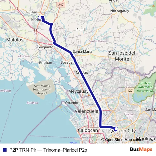 The first stop of the P2P TRN-Plr bus route is Trinoma and the last stop is Primark Town Center. P2P TRN-Plr (Trinoma–Plaridel P2p) is operational during everyday.