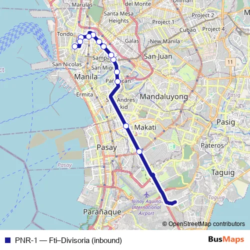 The first stop of the PNR-1 bus route is Magallanes Interchange and the last stop is Divisoria (Tutuban). PNR-1 (Fti–Divisoria (inbound)) is operational during everyday.