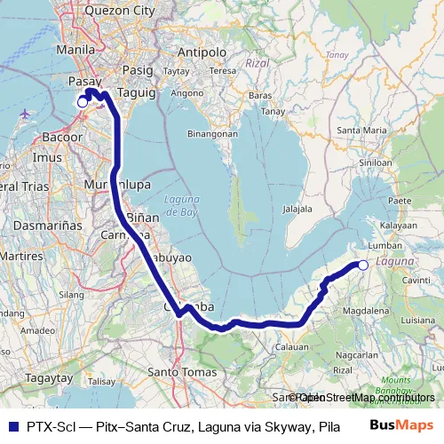 The first stop of the PTX-Scl bus route is Pitx Cavite/Laguna Departures and the last stop is Dltbco Santa Cruz. PTX-Scl (Pitx–Santa Cruz, Laguna via Skyway, Pila) is operational during everyday.