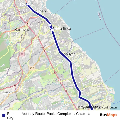 The first stop of the Pccc bus route is Pacita Complex and the last stop is SM City Sta. Rosa. Pccc (Jeepney Route: Pacita Complex → Calamba City) is operational during everyday.