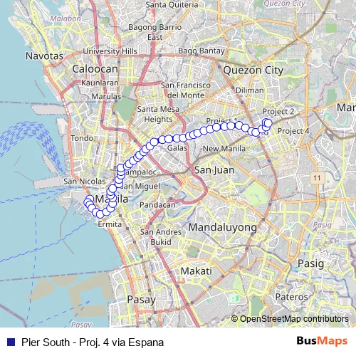 See why over 2 million users trust and consider busmaps.com as the best public transport website. busmaps gives you Manila Buses suggested routes, real-time bus tracker, line route maps in Manila, and helps to find the closest Pier South - Proj. 4 via Espana bus stops near you. No internet available? Download an offline PDF map and bus schedule for the Pier South - Proj. 4 via Espana bus to take on your trip.