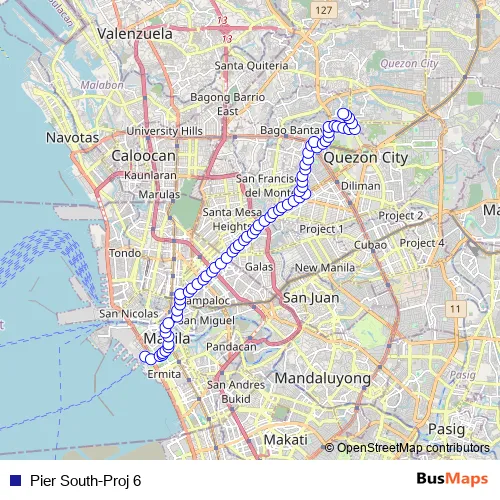 The first stop of the Pier South-Proj 6 bus route is 25th St / Antonio C. Delgado Intersection, Manila and the last stop is Road 3, Quezon City. Pier South-Proj 6 (Pier South-Proj 6) is operational during everyday.
