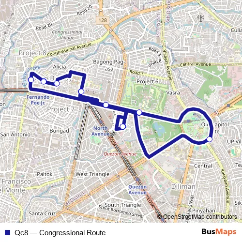 The first stop of the Qc8 bus route is Quezon City Hall and the last stop is QC Citybus North Ave. Vertis North Bus Stop. Qc8 (Congressional Route) is operational during everyday.